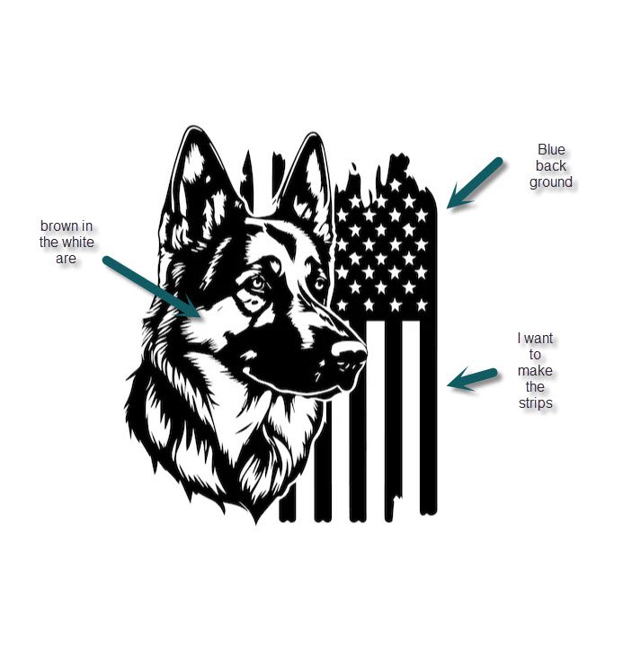 darcshadow 1,641 Posted September 29, 2025 Once the image is a vector there should be a command like break apart. That will allow you to pull the dog away from the flag easily. I would then draw a box over the star field of the flag and duplicate the flag and box. Move one copy of the flag and box over and then punch to erase the field leaving only the strips. On the second one do an intersection command which would leave only the star field. Share this post Link to post Share on other sites